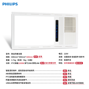 飞利浦(PHILIPS)一厨一卫套装集成吊顶实时数显风暖多功能五合一浴霸暖风机+洁恺二代集成吊顶灯9W 6500K |