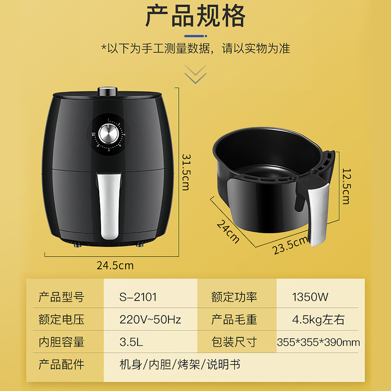 山本空气炸锅家用3.5升大容量无油烟电炸锅S2101【PP/黑色】 |