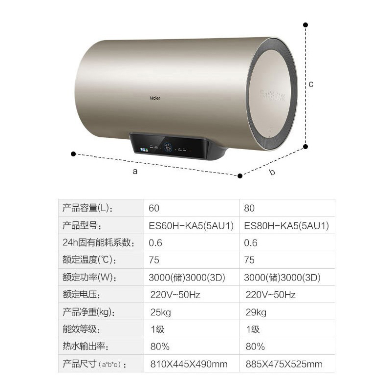 Haier/海尔 ES60H-KA5(5AU1) 电热水器3D速热60升 智能预约恒温储水式家用 一级能效【不锈钢/金色】 |