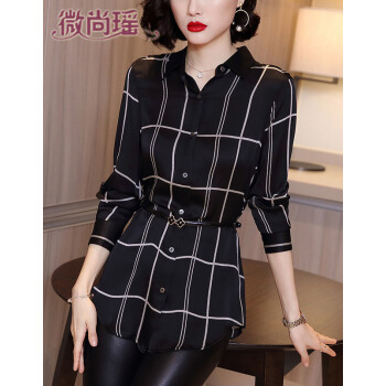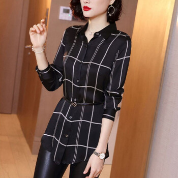 微尚瑶衬衫女秋季新款气质格子方领长袖系扣修身衬衣女时尚百搭中长款休闲上衣女7338 格子 请拍正确尺码 |