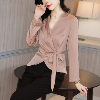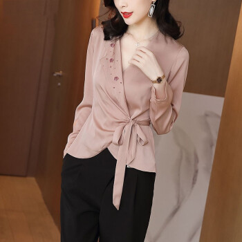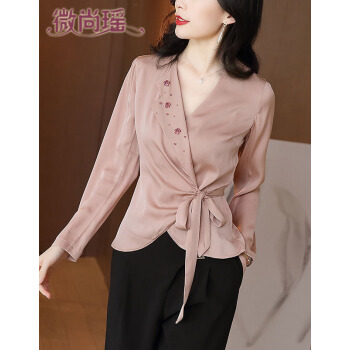 微尚瑶衬衫女秋季新款名媛风气质V领系带收腰钉珠上衣女时尚百搭优雅纯色长袖衬衫女7328 粉色 请拍正确尺码 |