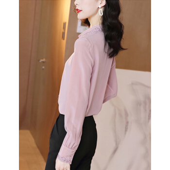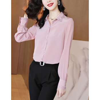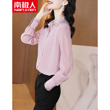 南极人 衬衫女长袖秋季新款韩版时尚宽松女装衬衣气质翻领蕾丝勾花刺绣小衫上衣潮 粉色 M |