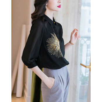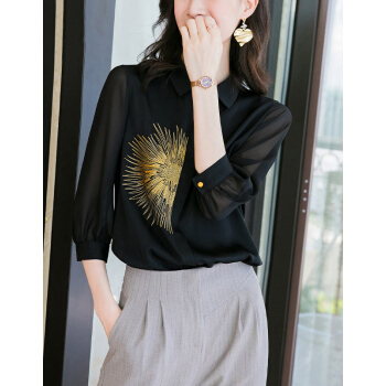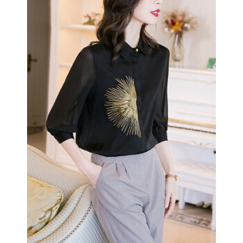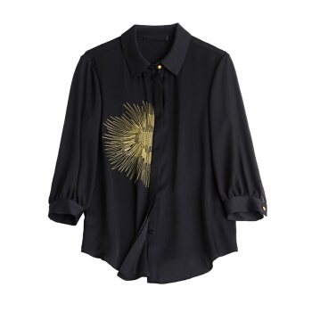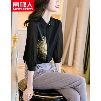 南极人 七分袖衬衫女夏季新款女装韩版时尚绣花宽松衬衣气质优雅POLO领上衣 N4-NRE11-9393-黑色 M |