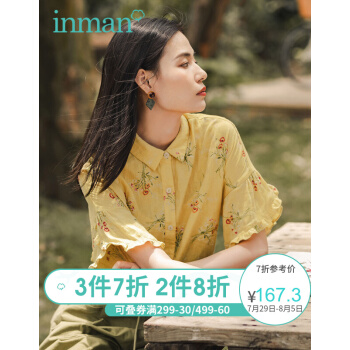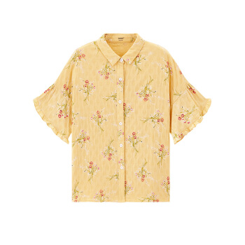茵曼秋装新款素雅印花中袖衬衣翻领宽松显瘦木耳边袖口衬衫女 阳光黄 S |