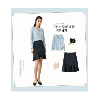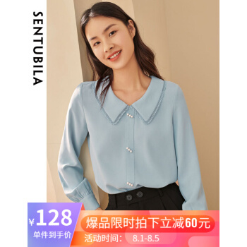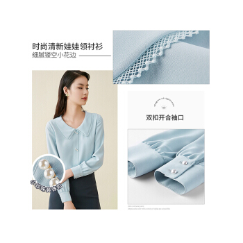 尚都比拉长袖女士衬衫秋装新款小花边娃娃领职业风雪纺珍珠扣上衣 浅灰蓝 M |