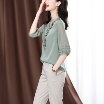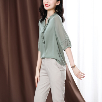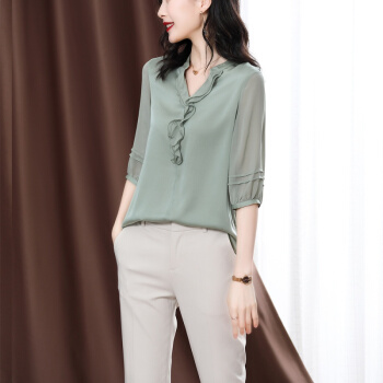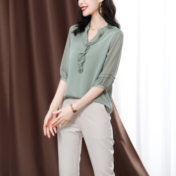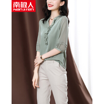 南极人 衬衫女短袖衬衣夏季新款女装雪纺小衫韩版时尚气质木耳边V领宽松上衣潮 N4-NRE233-1004-果绿 L |