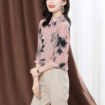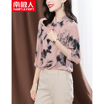 南极人 衬衫女夏季新款女装韩版时尚文艺复古七分袖衬衣蝴蝶结水墨印花雪纺小衫上衣潮 N4-NRA25-3001-粉色 XL |