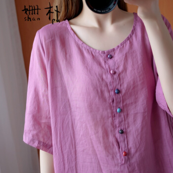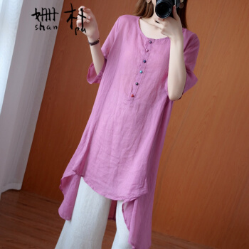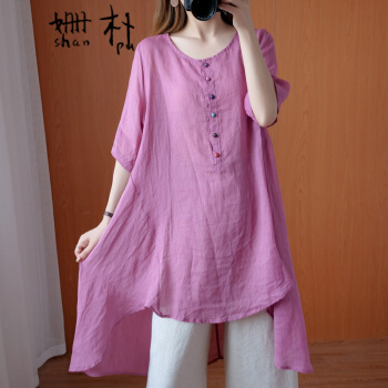 姗朴 棉麻衬衫女民族风夏季新款文艺复古大码女装宽松显瘦中长款不规则衬衫裙遮肚减龄衬衣小衫上衣 粉色 大码L【建议130斤以下】 |