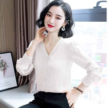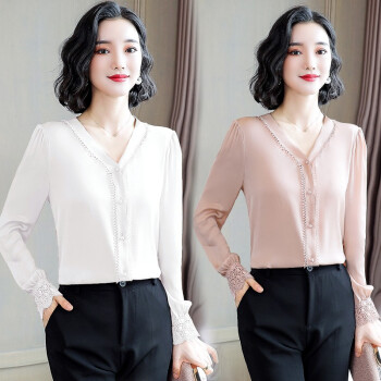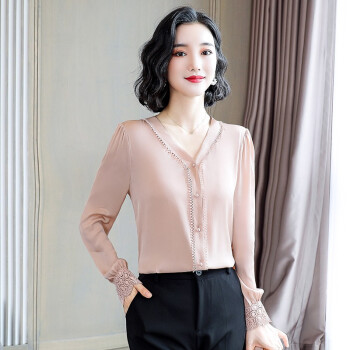 信和祥衬衫女夏秋季新款韩版上衣仿真丝时尚大码洋气V领雪纺缎面职业装衫打底小衫衬衣潮 皮粉色 M |