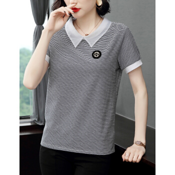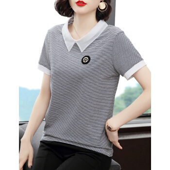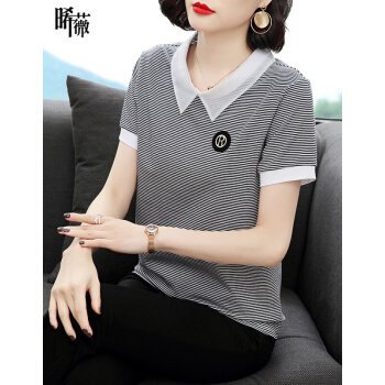 【精选好货】晞薇条纹T恤女短袖POLO领夏装新款中年妈妈体恤棉上衣宽松百搭打底衫夏 白色 M |