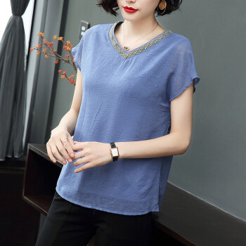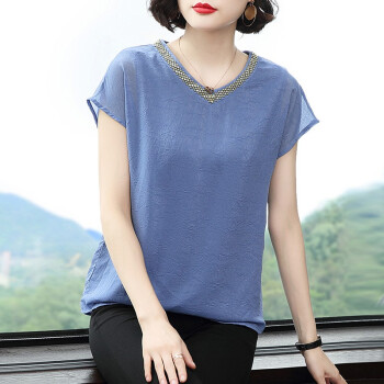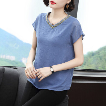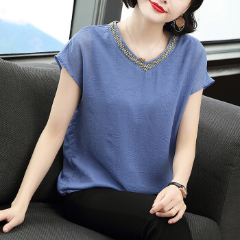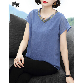 【精选好货】晞薇夏装新款时尚T恤女短袖韩版中年大码女装雪纺上衣夏妈妈装洋气宽松显瘦小衫遮肚 蓝色 请拍正确尺码 |
