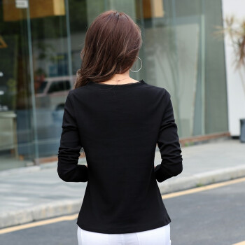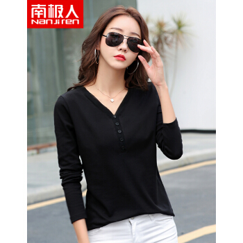 南极人 长袖t恤女95棉秋季女装新款韩版时尚V领纯色白色简约百搭修身显瘦上衣打底衫 XX39 高级黑 M |