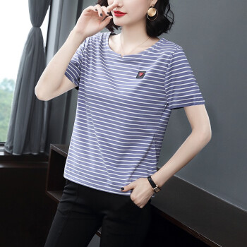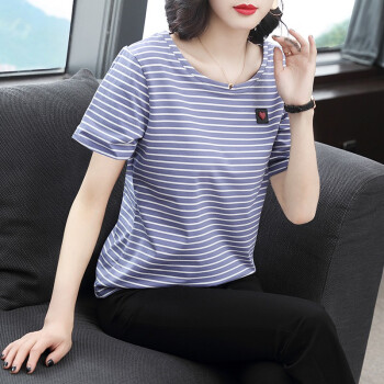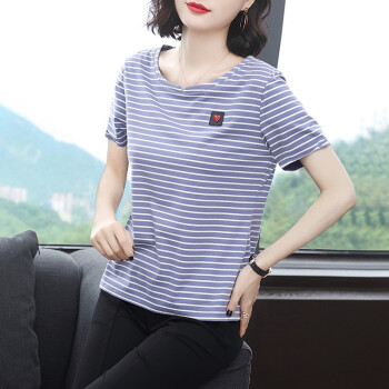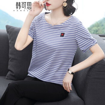 【精选好货】韩可思条纹短袖t恤女夏季新款韩版宽松百搭中年妈妈大码女装简约半袖蓝色上衣 蓝色 请拍正确尺码 |