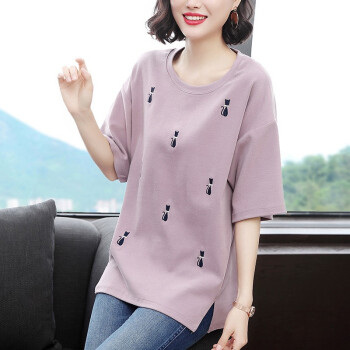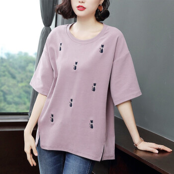 【精选好货】韩可思夏装新款大码女装宽松短袖t恤女小衫棉胖mm遮肚妈妈上衣衫中长款立体刺绣百搭 紫色 请拍正确尺码 |