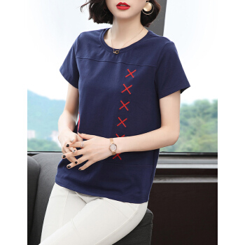 【精选好货】晞薇妈妈夏装小衫T恤短袖女新款中年妇女大码女装显瘦遮肚体桖棉宽松休闲上衣女 深蓝色 请拍正确尺码 |