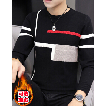 圆领毛衣男士针织衫秋冬季休闲有加绒加厚新款时尚修身男士套头打底毛线衣韩版潮流上衣服帅气青年男装 不加绒67090红线-黑色 XL |