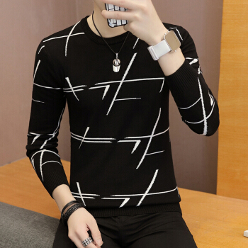 圆领毛衣男士针织衫秋冬季休闲有加绒加厚新款时尚修身男士套头打底毛线衣韩版潮流上衣服帅气青年男装 不加绒67090红线-黑色 XL |
