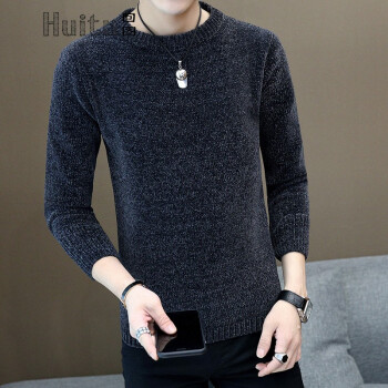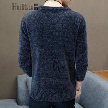 回图 秋冬季毛衣男圆领雪尼尔加绒加厚款毛衫半高领针织衫韩版潮流修身冬装衣服纯色长袖t恤情侣男装毛线衣 深灰蓝色 XL |