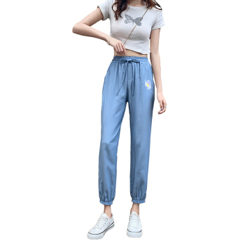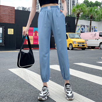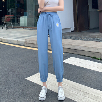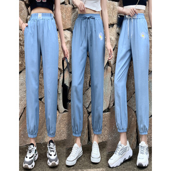 五个橘子牛仔裤女冰丝 新款女裤夏薄韩版宽松大码学生小雏菊九分裤女束脚裤高腰天丝休闲哈伦裤垮裤 无抽绳 L |