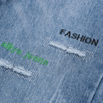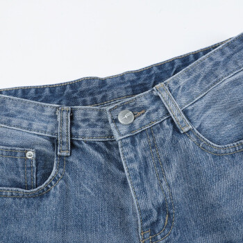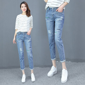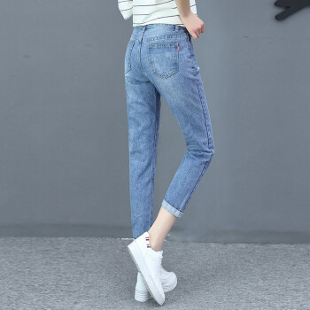 艾比新休闲牛仔裤女夏季新款韩版女装宽松高腰显瘦女裤百搭薄款九分哈伦小脚直筒裤老爹破洞裤子潮 蓝色 L |