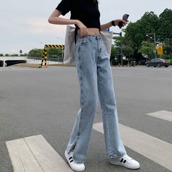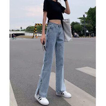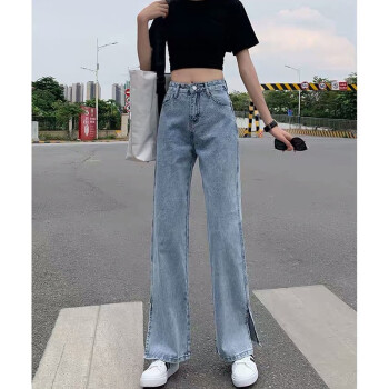 丝克诺依 牛仔裤女阔腿裤夏季薄款新款浅色开叉直筒宽松泫雅风高腰垂感拖地裤潮 浅蓝长裤 M |