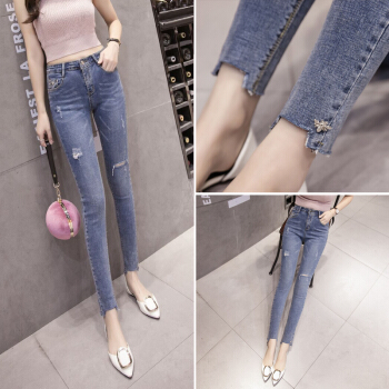 miss nitaly 女士破洞紧身牛仔裤夏季新款韩版女高腰显瘦显高铅笔裤修身百搭小脚九分裤 蓝色 M98-110斤 |