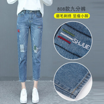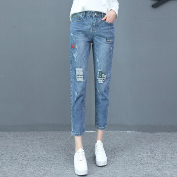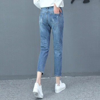 卓芭莎九分牛仔裤女夏季新款薄款宽松休闲直筒裤子女破洞小脚女裤潮 蓝色-九分裤 M |