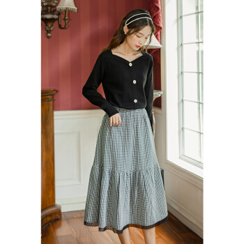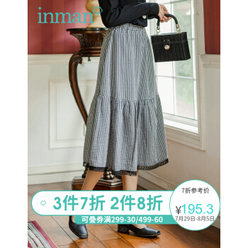 茵曼秋装新款松紧高腰A字中长款学院花边文艺复古格子半身裙【F1803571】 黑格 L |