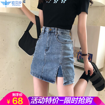 欧贝汐牛仔裙半身包臀裙夏季学生高腰短裙开叉半身裙裤女士裙子 蓝色 S |