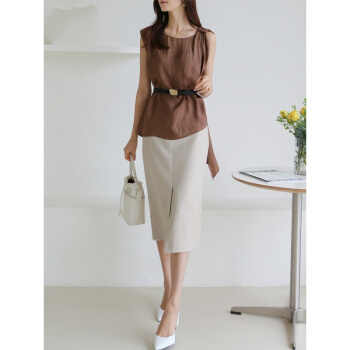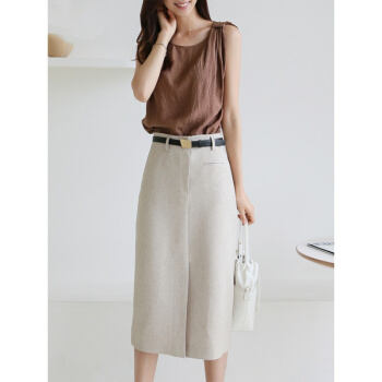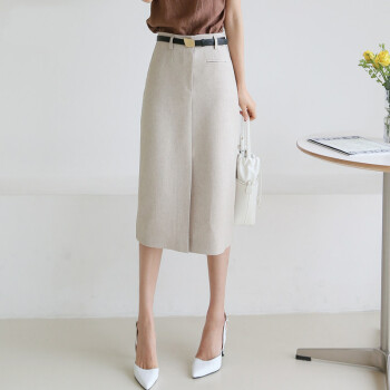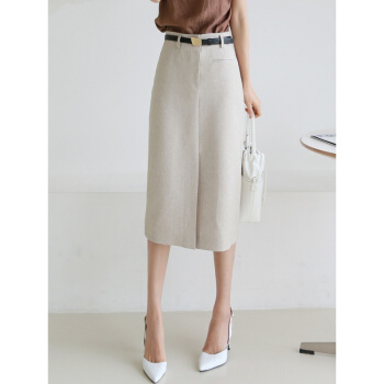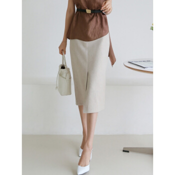 SRN轻奢女装 高腰半身裙女夏新款修身显瘦包臀裙气质通勤开叉一步裙中裙 灰杏色 S |