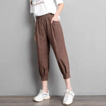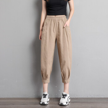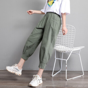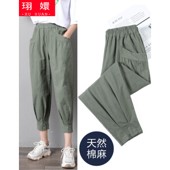 珝嬛棉麻休闲裤女七分哈伦裤子新款学生胖mm高腰宽松显瘦夏季亚麻工装灯笼裤女薄款运动裤大码女装 军绿色 此码勿拍.请拍自身对应码数 |