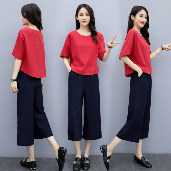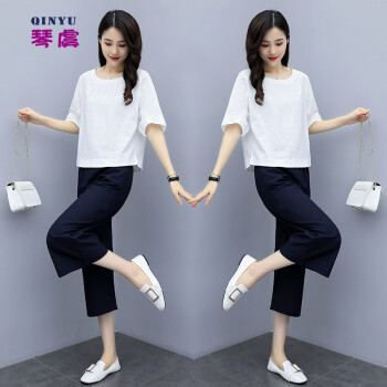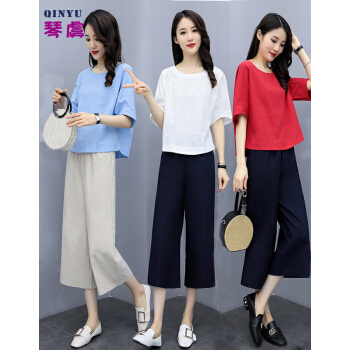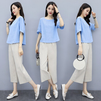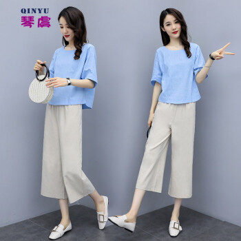 琴虞QY休闲套装女休闲裤女棉麻套装女夏新款宽松时尚亚麻小个子休闲纯色短袖+阔腿裤裙亚麻两件套 天蓝色套装 M(建议95-105斤) |