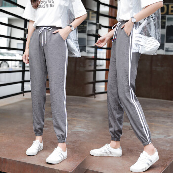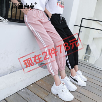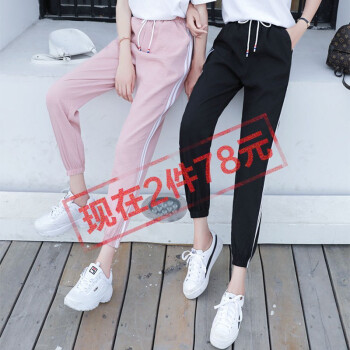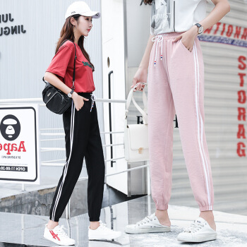 南星点点棉麻休闲裤女冰丝九分哈伦裤夏裤子韩版新款侧条纹学生原宿bf束脚裤子女 粉色 M |