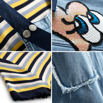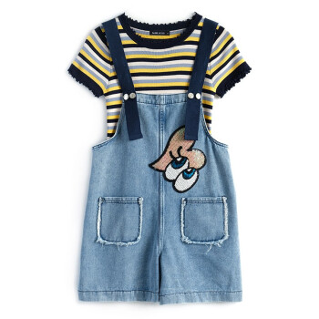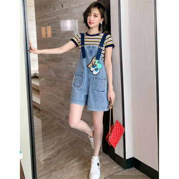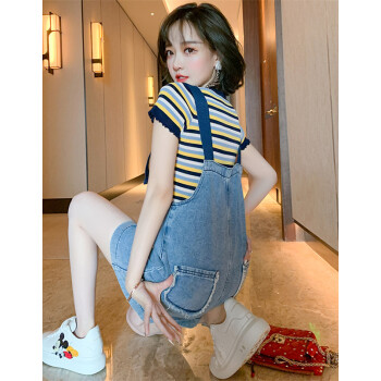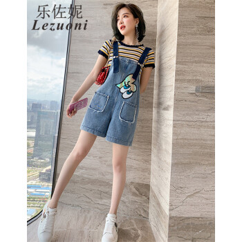 乐佐妮短裤女套装牛仔背带裤夏季新款条纹短袖T恤两件套阔腿裤 条纹+牛仔蓝 S |