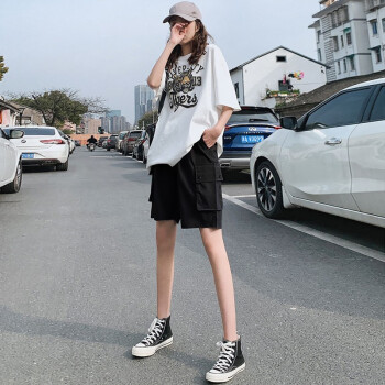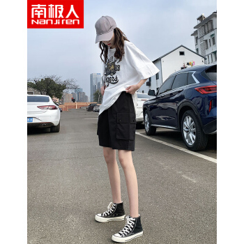 南极人 五分工装短裤女宽松新款夏季薄款高腰百搭休闲裤运动中裤潮ins YYR867 带扣黑色 请拍正确尺码 |