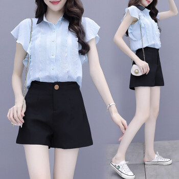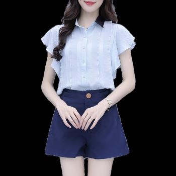 思语林 雪纺衫短裤套装女夏装新款小个子显高洋气减龄休闲短裤子两件套 粉色套装 S |