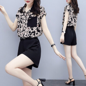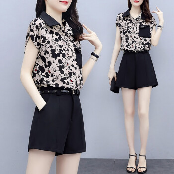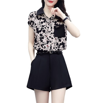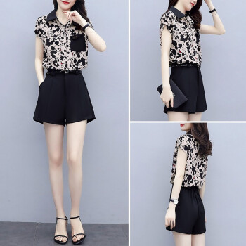 缪资 夏季新款韩版时尚雪纺套装女休闲气质短裤小个子洋气两件套潮 黑色套装 M |