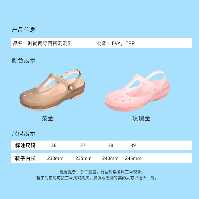【超值单品】两双 百搭舒适休闲滩凉洞洞鞋【底:EVA,面:TPR/玫瑰金】 |