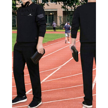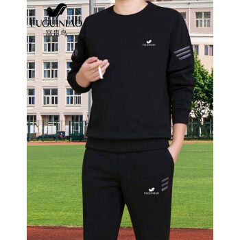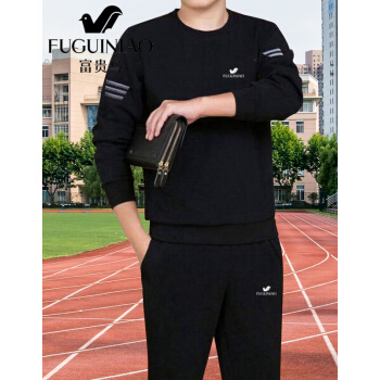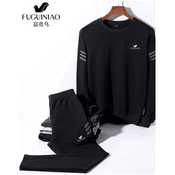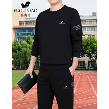 富贵鸟 卫衣男套装秋冬季新款圆领大码运动套装中青年男士加绒打底衫长袖T恤男装 黑色春秋款两件套 XL (适合130~147斤体重) |
