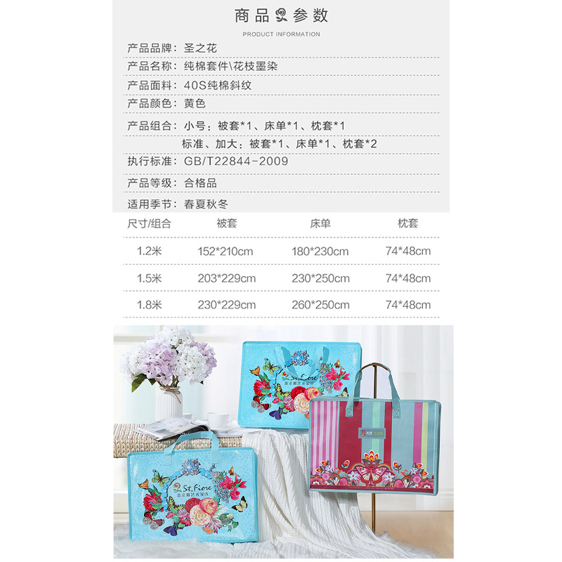 花枝墨染 床单四件套(被套1件床单1件枕套2件)(适合1.5米床)【纯棉/黄】 |