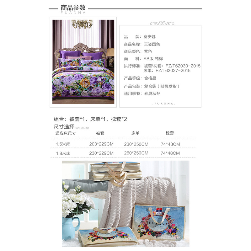 天姿国色 床单四件套(被套1件床单1件枕套2件)(适合1.5米床)【纯棉磨毛/紫】 |