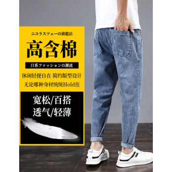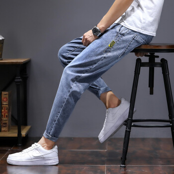巴迈罗 牛仔裤男士休闲裤男潮牌裤子男新款夏季韩版修身直筒束脚中高腰弹力复古磨透气小脚九分长裤子男 607#浅蓝 31 |