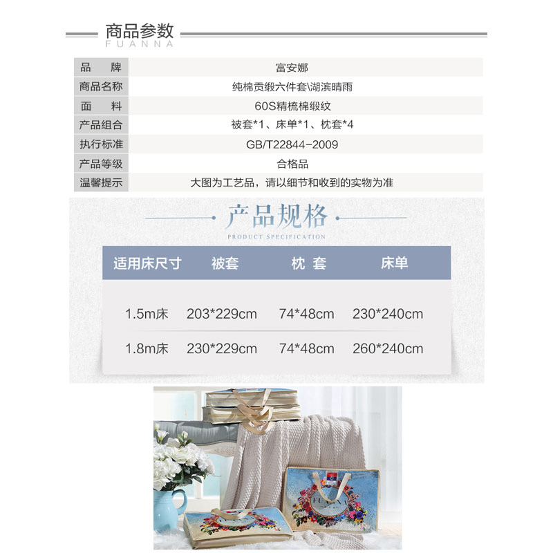 湖滨晴雨 床单六件套(被套1件床单1件枕套4件)(适合1.8米床)【纯棉缎纹/蓝】 |