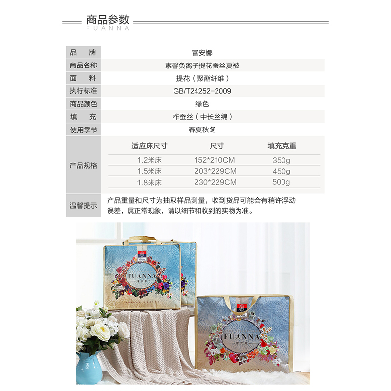 素馨负离子提花蚕丝夏被(夏被1件)(适合1.8米床)【面料:聚酯纤维;填充:柞蚕丝(中长丝绵)/绿】 |