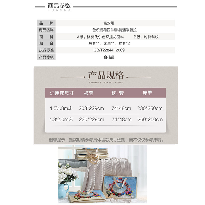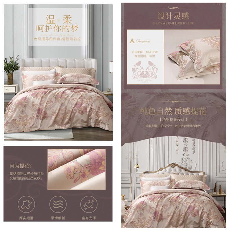情迷欧若拉 床单四件套(被套1件床单1件枕套2件)(适合1.5米床)【面料:A版:涤莫代尔色织提花;B版:纯棉斜纹/浅黄】 |