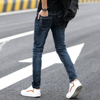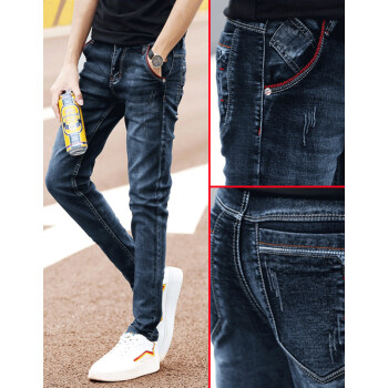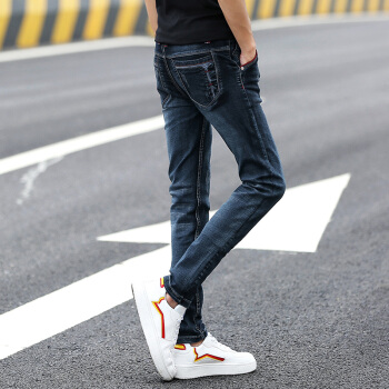 牛仔裤男春夏修身小脚裤男韩版休闲裤子男士潮流水洗牛仔直筒长裤青少年百搭运动裤男装 002蓝黑 30码-2尺3 |