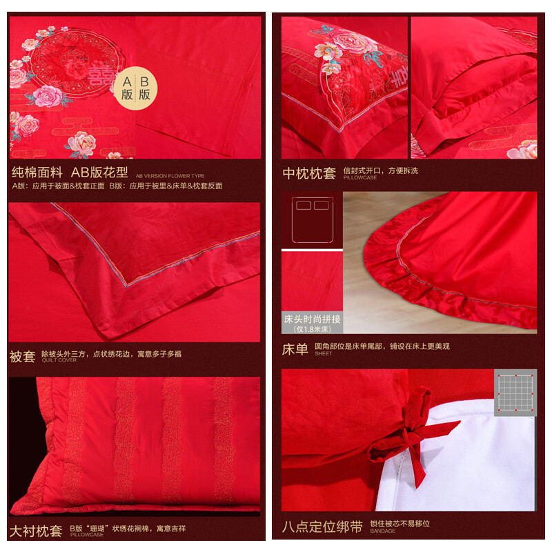 花好月圆 床单八件套(被套1件床单1件枕套4件方抱芯1件方抱套1件)(适合1.5米床)【纯棉提花/红】 |