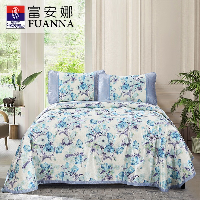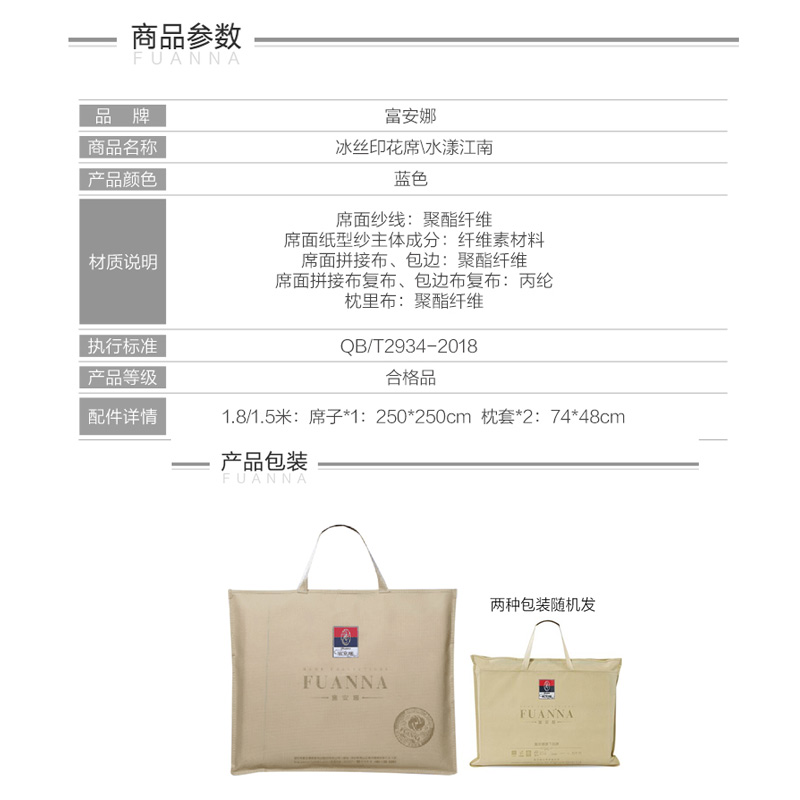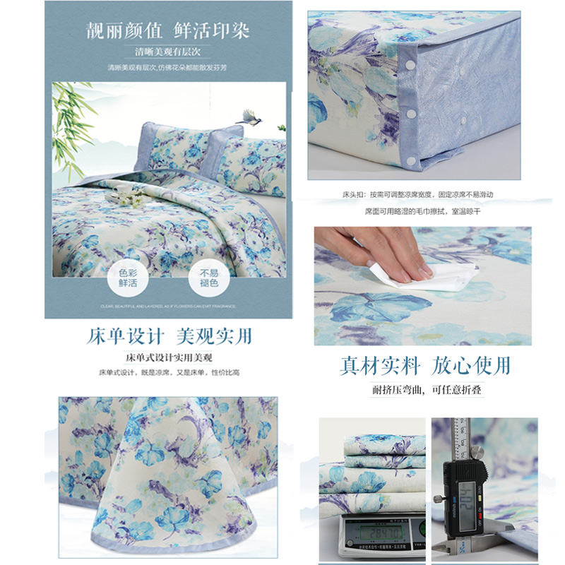 水漾江南 冰丝印花席床单款三件套(凉席1件枕套2件)(适合1.5-1.8米床)【聚酯纤维+纤维素材料/蓝】 |