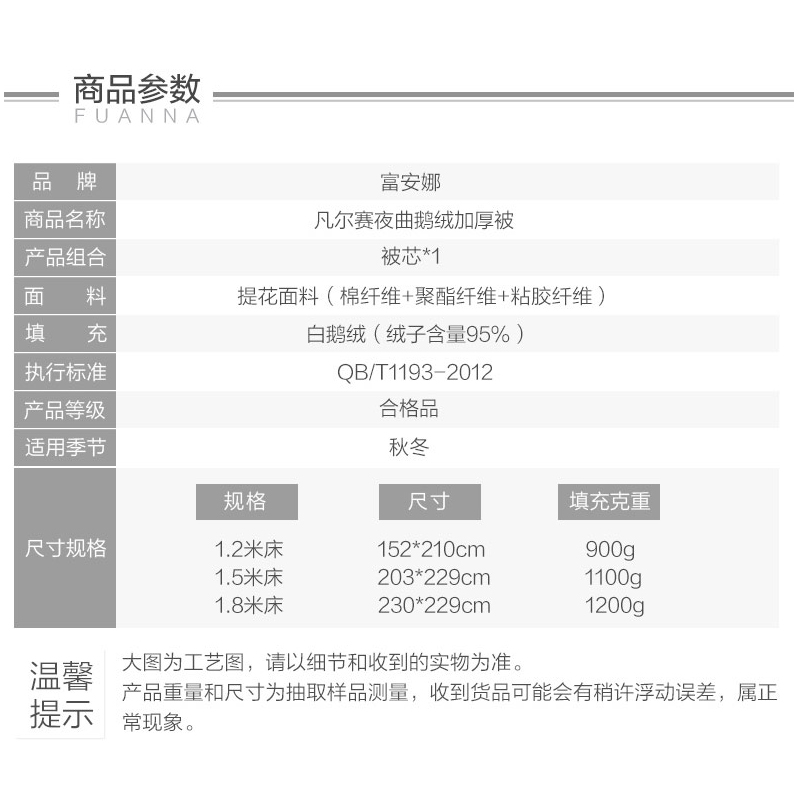 凡尔赛夜曲鹅绒加厚被(被芯1件)(适合1.5米床)【面料:涤竹棉提花;填充:95%白鹅绒/灰】 |