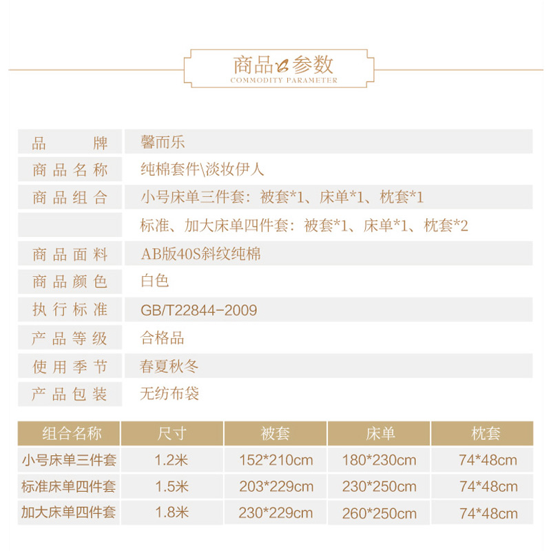 淡妆伊人 床单四件套(被套1件床单1件枕套2件)(适合1.8米床)【40支纯棉/白】 |